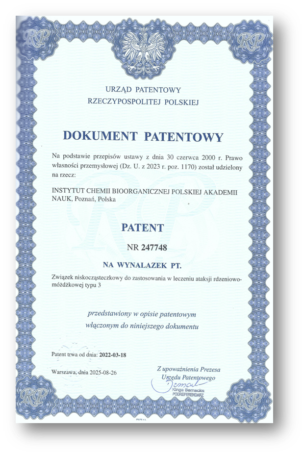 Patent polski: PL 247748 ZWIĄZEK NISKOCZĄSTECZKOWY DO ZASTOSOWANIA W LECZENIU ATAKSJI RDZENIOWO-MÓŻDŻKOWEJ TYPU 3 Data pierwszeństwa: 2022-03-18 Twórcy: Maciej Figiel, Piotr Piasecki, Kalina Wiatr Uprawniony: Instytut Chemii Bioorganicznej Polskiej Akademii Nauk Przedmiotem zgłoszenia jest związek niskocząsteczkowy do zastosowania w leczeniu ataksji rdzeniowo-móżdżkowej typu 3, przy czym związek ten jest wybrany spośród bortezomibu, karfilzomibu, VLX1570 lub oprozomibu. Prezentowany patent o numerze zgłoszenia P 440687dotyczy nowego zastosowania innowacyjnej cząsteczki w leczeniu ataksji rdzeniowo-móżdżkowej typu 3 (SCA3). SCA3 to postępująca choroba neurodegeneracyjna występująca z częstością ok. 3 przypadków na 100 000 urodzeń, co kwalifikuje ją do grupy chorób rzadkich. Choroba ma charakter postępujący i prowadzi do nieodwracalnego uszkodzenia móżdżku, powodując zaburzenia koordynacji ruchowej, pogorszenie wzroku i zaburzenia mowy. Patent chroni innowacyjne rozwiązanie terapeutyczne wykorzystujące inhibitory proteasomu – niskocząsteczkowe związki aktywne: bortezomib, karfilzomib, VLX1570 oraz oprozomib. Opisywane farmaceutyki, zatwierdzone przez FDA w onkologii, wykazują również potencjał terapeutyczny w neurologii.Mechanizm działania opiera się na interakcji z białkiem ATXN3, kluczowym w patogenezie SCA3, które uczestniczy w proteasomalnej degradacji białek. Komercjalizacja tej technologii otwiera nowe możliwości dla np.: - firm biotechnologicznych rozwijających terapie chorób rzadkich, - przedsiębiorstw farmaceutycznych specjalizujących się w neurologii, - laboratoriów badawczych prowadzących badania kliniczne, - inwestorów zainteresowanych rynkiem leków neurologicznych. Więcej o patencie: https://ewyszukiwarka.pue.uprp.gov.pl/search/pwp-details/P.440687